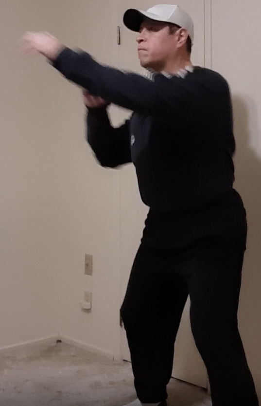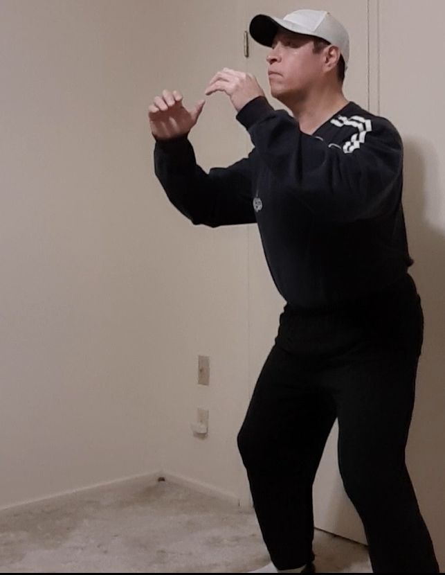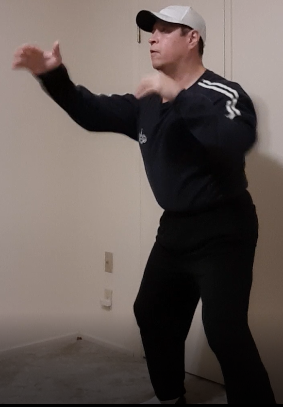 Standing upright with your back straight, keep your head level and look straight ahead. Keep your feet at roughly shoulder width apart. Bend your knees slightly and get into a “fighting stance”. That is, raise your hands to shoulder level and slightly lean forward. Remember to retract your shoulders back and down to ensure your shoulder girdle is properly positioned.