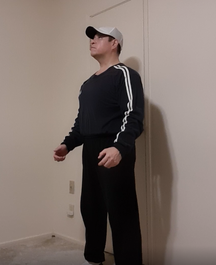 Stand straight with your head level and eyes forward. Slightly bend your knees and retract your shoulder blades back and down.