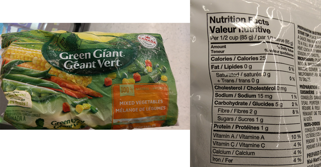 These frozen vegetables are a much better choice than canned mixed vegetables. The sodium count per serving for these mixed vegetables is 15 milligrams per half cup compared to 260 milligrams per half cup for canned vegetables. The next time you are at your grocery store, ditch the canned vegetables and go with the frozen vegetables (or fresh vegetables).