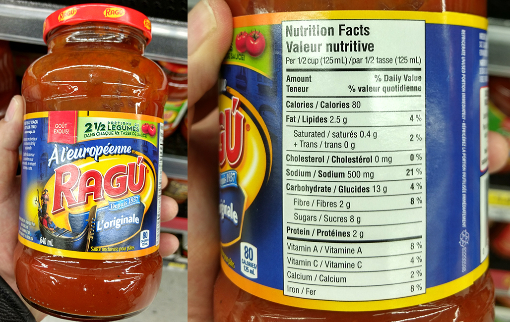 Pasta sauces are loaded with sodium. The serving size is usually very low and if you take a look at the average pasta sauce it is usually very high with a low serving size. Take a look at the image below. At ½ cup, this pasta sauce contains 500 milligrams of sodium. Who has only a ½ cup of pasta sauce? Nobody does. At the very minimum most people will have one cup of pasta sauce.