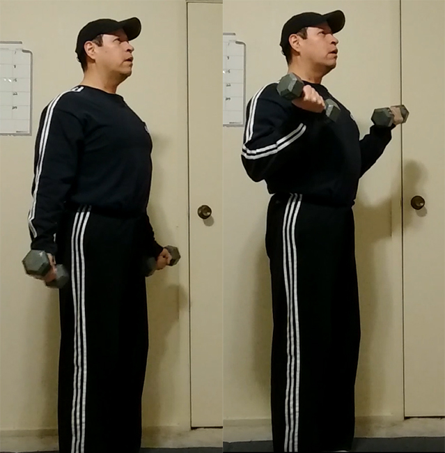 curl: Breathe in as you curl the weight up and breathe out as you lower the