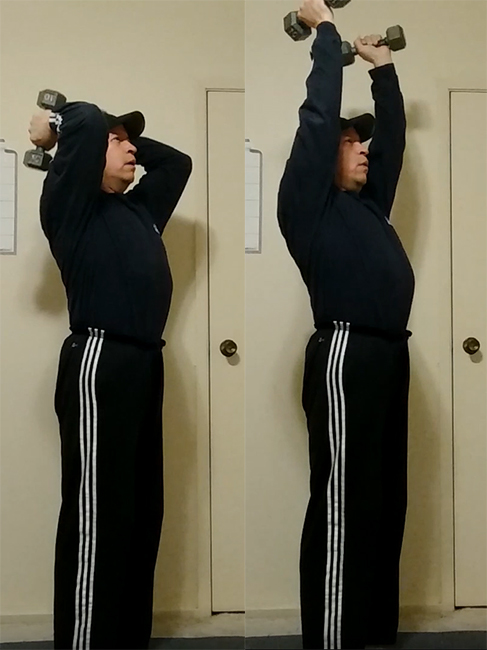 Overhead extensions: Breathe in as you lower the dumbbells and breath out as raise