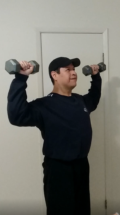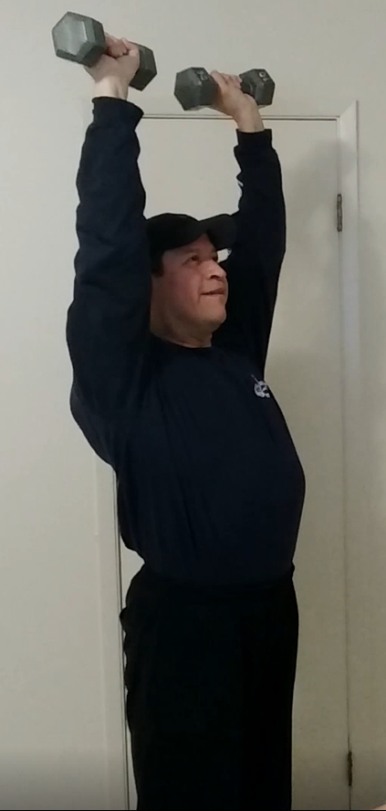 Dumbbell curl to shoulder press exercise - Arms extended upwards position