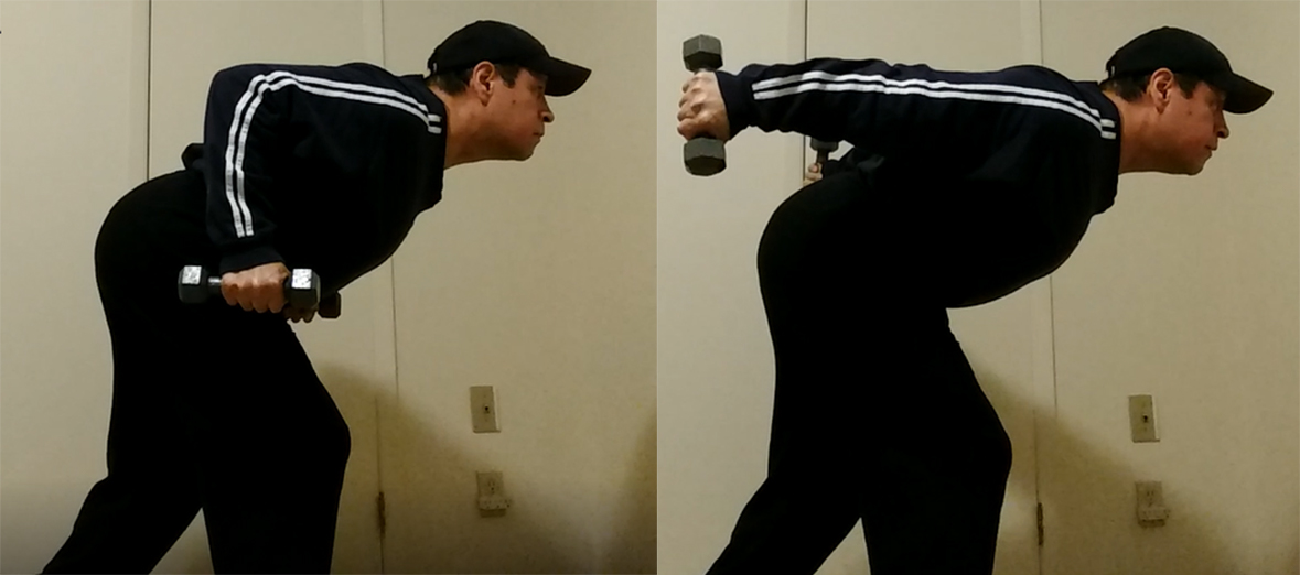 dumbbell hammer curl). Bend at the waist until your upper body is almost