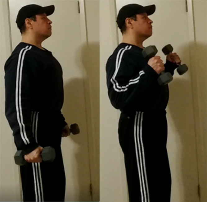 · It’s very important that you retract your shoulder blades for each exercise. Do not allow your back to round while doing the dumbbell hammer curls. Keep your shoulders back and down while keeping your upper arms stationary.