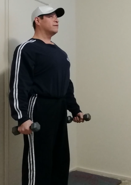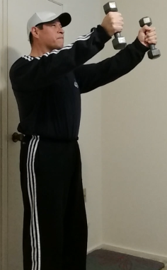 That is, it is important the keep constant tension on the target muscle group (shoulders) and really “feel” the movement as you raise and lower the weight. I suggest using light dumbbells for this exercise and if you have never weight trained before, try using no weight. Turn your hands so that your thumbs are pointing forward (if you are using no weight).