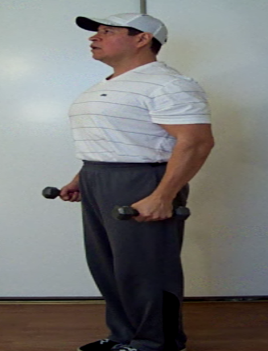 With your feet at shoulder width stance, grab a pair of dumbbells from the floor (bend at the knees). Stand up straight with the dumbbells at your sides. The palms of your hands should be facing each other (your palms should be facing outwards). Move your shoulders back and down and puff your chest out slightly. This will allow put your shoulder girdle into proper position. Keep your head level and eyes looking straight ahead. Bend your arms slightly.