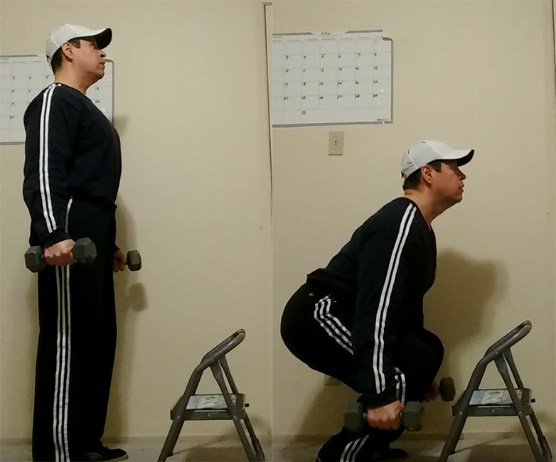· Don’t look down when you are performing the dumbbell squat. This may cause you to lose balance and affect your posture (rounding your back). Keep your eyes forward