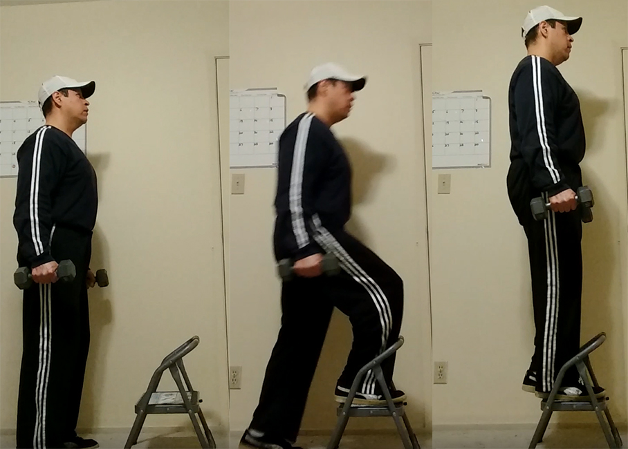 Dumbbell stair step up: Breathe in as step up and breath out as you step down.