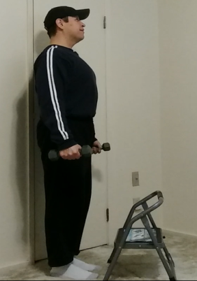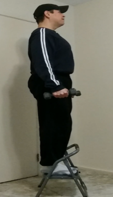 Place your feet a few inches away from the edge of the step. Grab a pair of dumbbells from the floor and stand up straight with your arms loose and at your sides. Retract your shoulders back and down and slightly puff out your chest. Keep your head level and look straight ahead. I suggest picking a spot on the wall and keep your eyes focused on that spot throughout the movement.