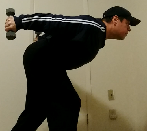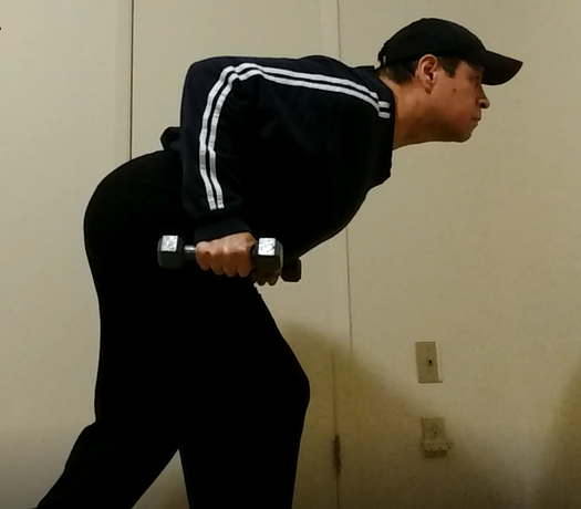Grab a pair of light dumbbells and holding the dumbbells with both hands, stand up straight with the dumbbells at your sides. Bend at the waist and lean forward until your body is bent at close to 90 degrees. In a rowing motions, row your arms up until they are parallel to the ground while keep your elbows at 90 degrees. This is your starting position.