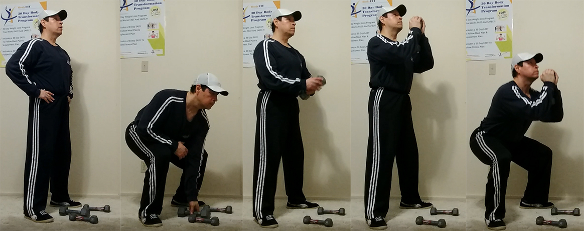 Without question, this is one of the more efficient and effective leg building combinations you can perform at home. The main reason is that this superset uses two compound movements which will employ just about every major muscle group in the body. The end result is a much more efficient muscle building and fat burning effect. The first exercise is called the goblet squat and this movement will target the quadriceps, hamstrings, butt, hips and lower back.