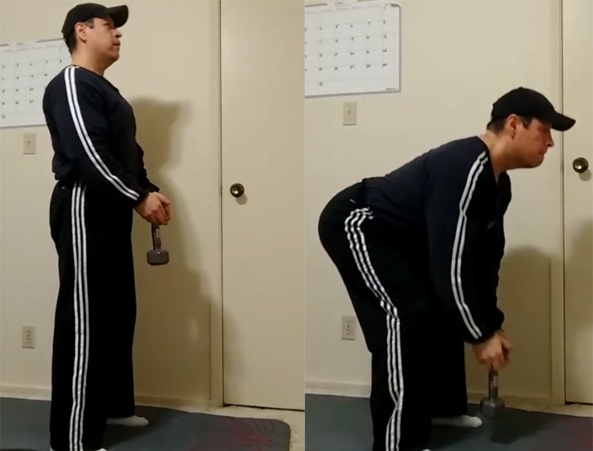 Slowly bend at the waist until you feel a slight stretch in your hamstrings. The dumbbell should be just below your knees. Pause for a moment concentrate on using your hamstrings, hips and butt to propel you back to the starting position. Squeeze your butt and hamstrings once you in the starting position (top).