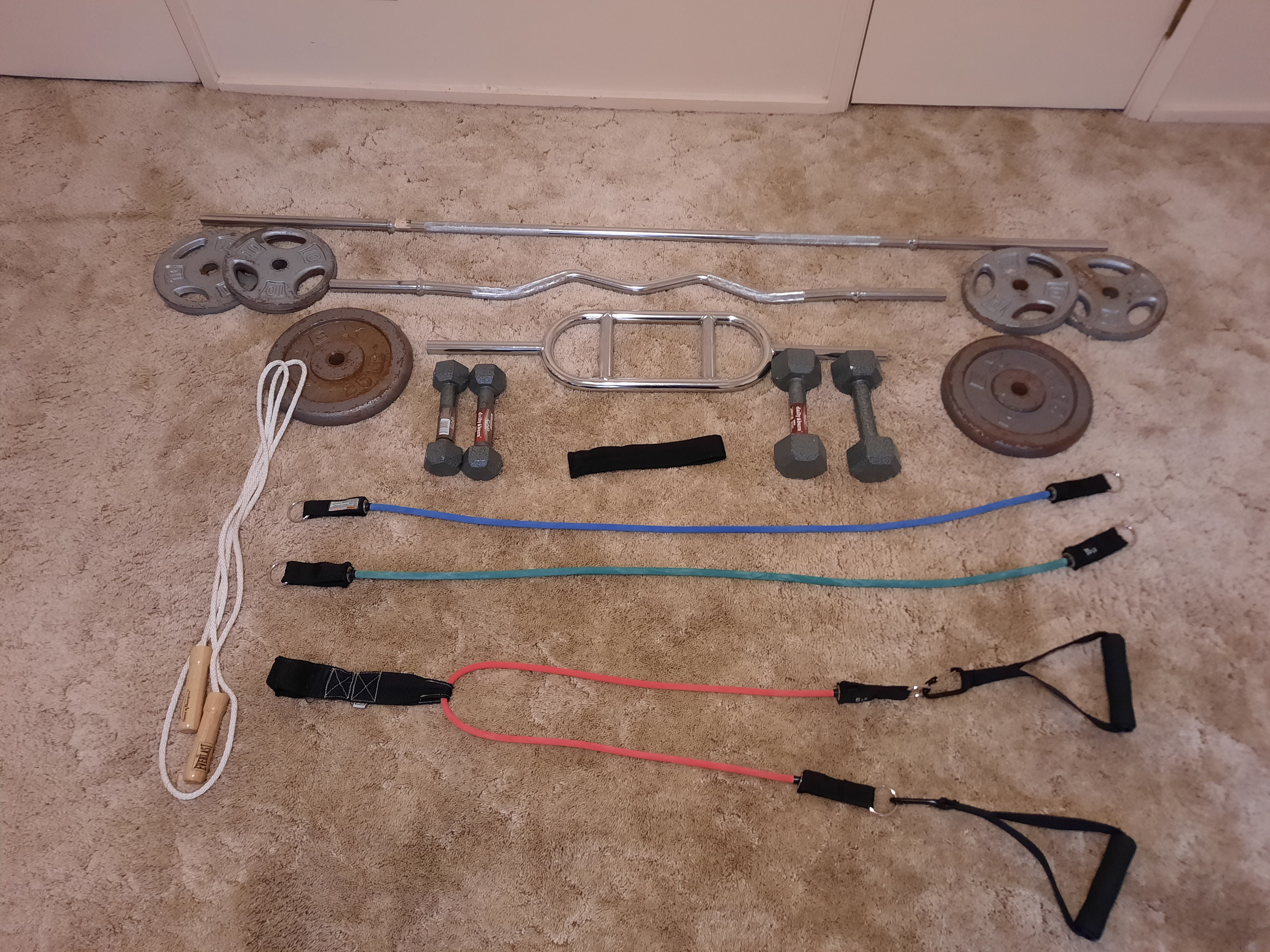 When Covid hit, which closed down my local gym, I had to think quick and come up with a suitable home workout set up. I dug around my closet and came up with and found some light dumbbells (5 and 10 pounds), a barbell, a curling bar (z shaped bar), a triceps bar (with the handles), some weight plates, a jump rope and my GoFit resistance band door anchor system.