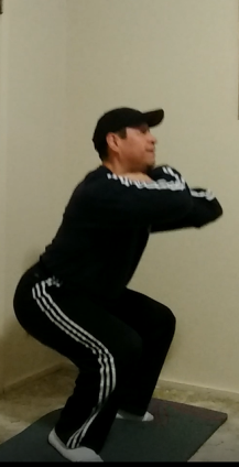 Slowly bend at the knees keeping your back straight and looking forward (the spot on the wall). You can either keep your arms at your sides or folded in front of you. Squat until your knees are just above parallel, pause for a moment and using your thighs, push your body back up to the start position. Repeat as needed.