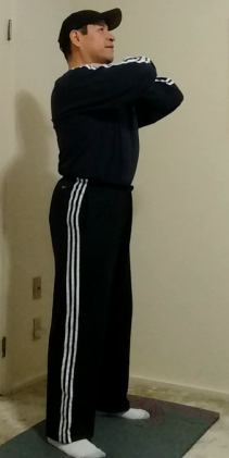 With your feet at shoulder width apart, stand with your back straight and head level. Pull your shoulders back and down and puff your chest out. You will also want to arch your back slightly. Looking straight ahead, pick a spot on the wall and focus in on it. You will be looking at that spot on the wall as you perform the exercise. Keep your heels flat on the floor as you perform the bodyweight squat exercise.