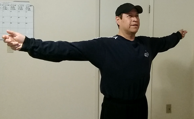 Using your shoulders (and not your upper back), make small clockwise circles for a series of repetitions. Stop and perform another series of repetitions moving your arms in a counter clockwise motion for a series of repetitions. Once complete stop and lower your arms.