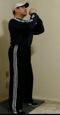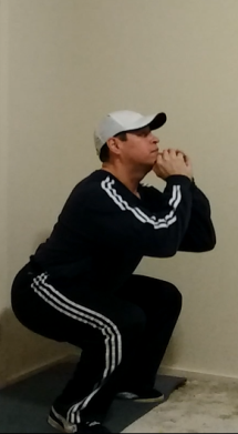 Slowly bend at your knees and “squat” down while keeping your back straight. Keep your eyes focused on the spot on the wall and squat down until your knees are just above parallel with the floor. Pause for a second or two in the squat position and squat back up to the start position. Repeat as needed.