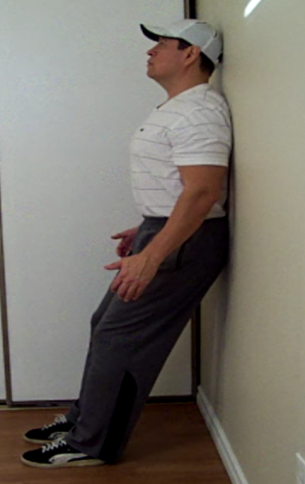 Stand with your back flat against the wall. Make sure the backs of your shoulders are flush against the wall and slightly puff out your chest. This will make sure your shoulders are aligned with your lower body. Move your feet 2 to 3 feet from the wall and gently bend at the knees to lower your body. Lower your body until you are just above parallel. Remember to keep your head level and eyes looking straight ahead. This is your starting position.