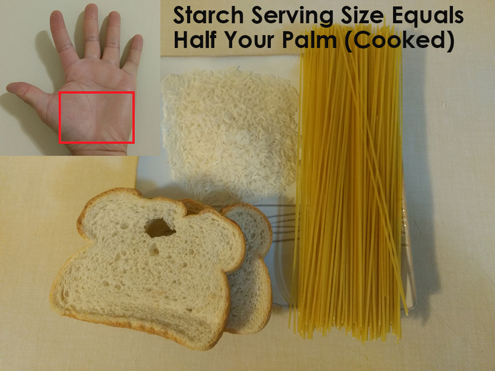 Starchy Carbohydrate Sources: Half the size of your palm (cooked). This goes for any rice, pasta, or potatoes.
