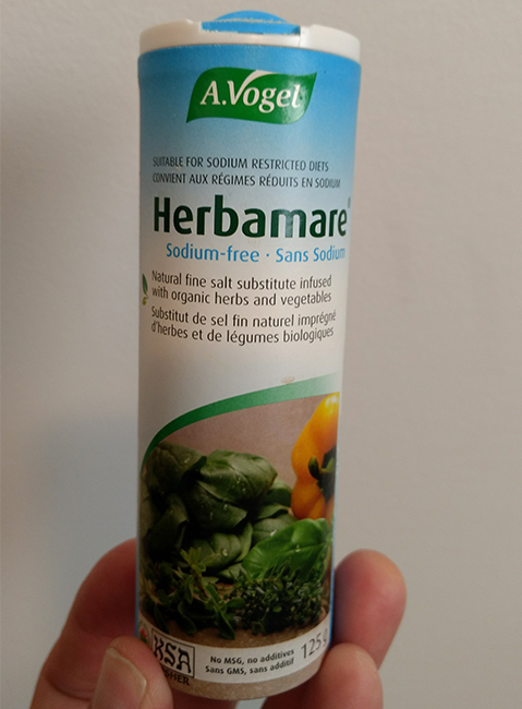 Salt free spice hybrid: Herbamare by Vogel. I love using this spice as well. This spice contains a bunch of ground up spices and uses potassium as the sodium substitute. It tastes AWESOME! You can find Herbamare at your local health food store or in the organics section of your local grocery store.
