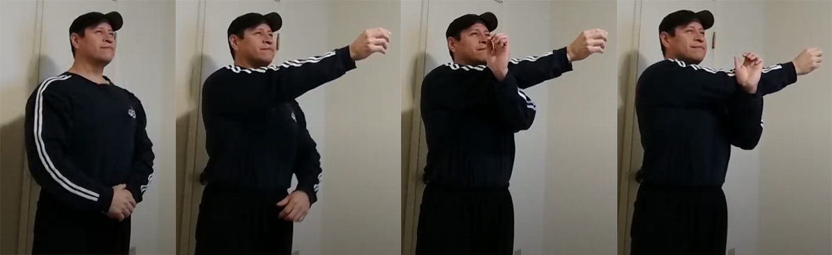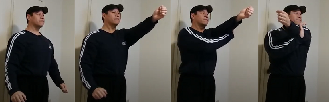 Stand with your back straight and your shoulders retracted. Puff your chest out. Lift your right arm up so that it is parallel to the ground. Remember, keep your shoulder retracted (don’t allow it to move forward).