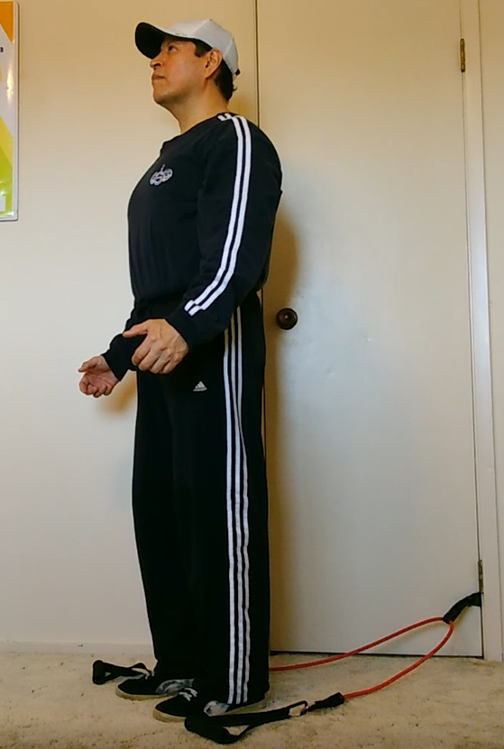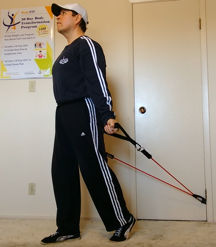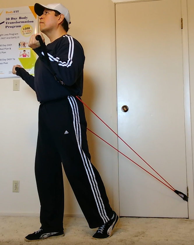 The resistance band biceps curl exercise is one of my favorites. The main reason is because I can retract my shoulders back further than if I was to use a barbell or dumbbells. It is very important to keep your shoulders retracted and stationary during the biceps curl to 1) get the most benefit from the movement; and 2) to keep your shoulders safe. This resistance bands allow me to really concentrate on working my biceps and NOT the front of my shoulders (which can cause problems).