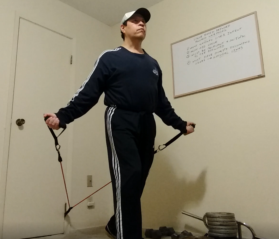 Stand between the handles and bend down to pick them up (in each hand). With both handles in your hand, turn them so that your palms are facing upwards. Take a few steps forward until you feel some tension in the bands. Retract your shoulder blades back and down and puff your chest outwards. Move your arms outwards by about a foot or so (from your hips). Keep your head level and eyes forward. Lean forward slightly. You may want to take a step forward with either your left or right leg to keep better balance. Keep your arms slightly bent.