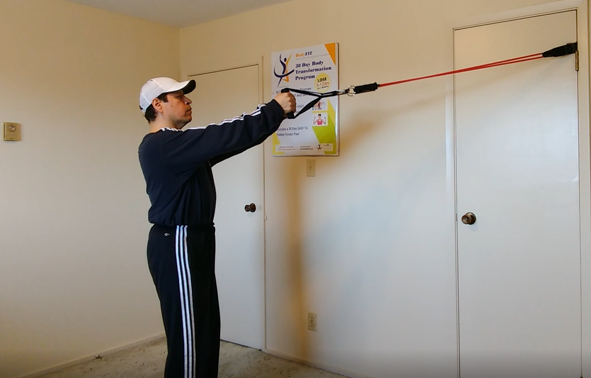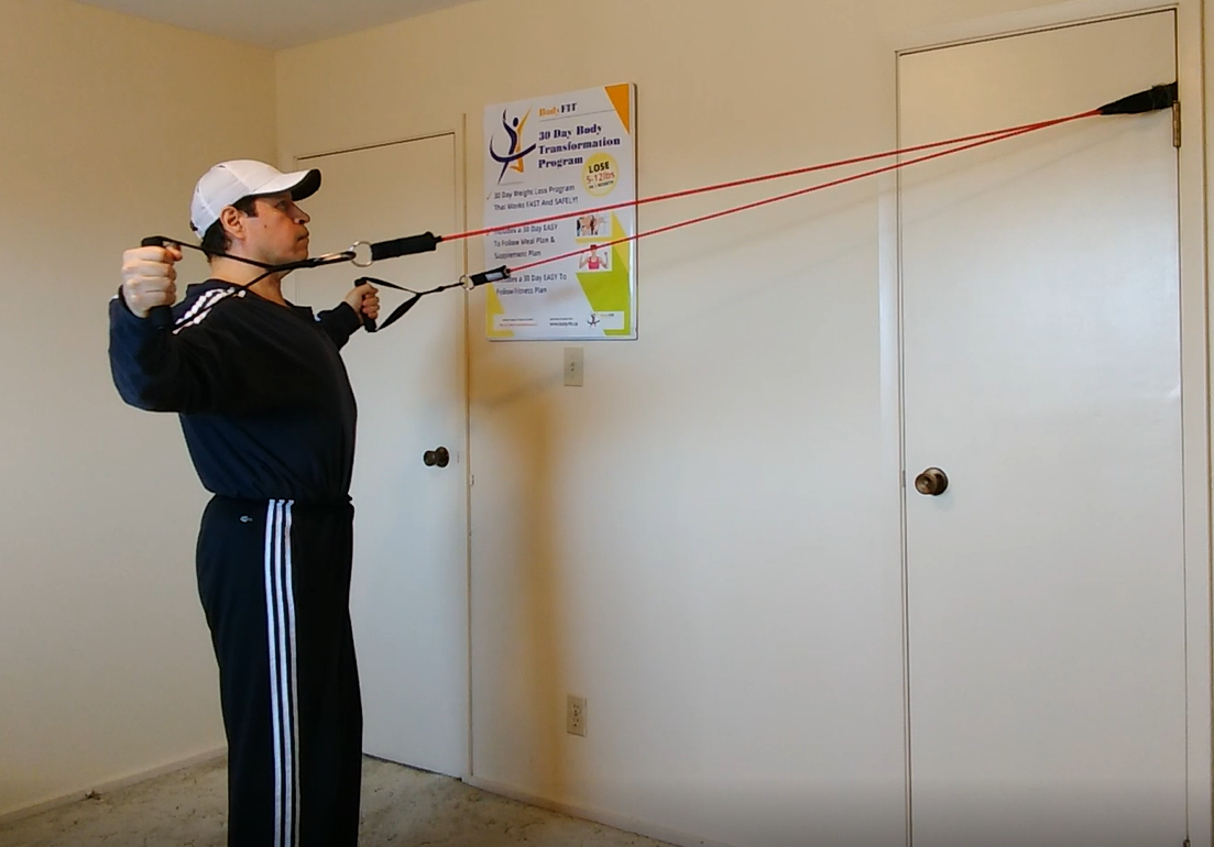 Place the anchor for your resistance bands near the top part of your door, preferably for the door hinge. Stand back and face the resistance bands. Approach the resistance bands and grab both handles and take a few steps backwards. Make sure your back is straight, your shoulders are retracted back and down and your chest is puffed out. Once you feel tension in the resistance bands, lift your arms until they are directly in front of you in a fully extended position. Keep your head level and eyes forward (don’t look down).