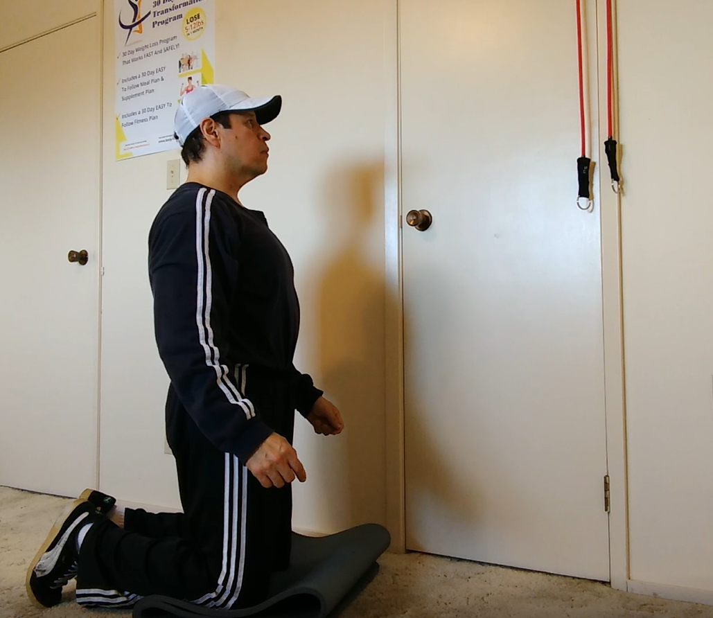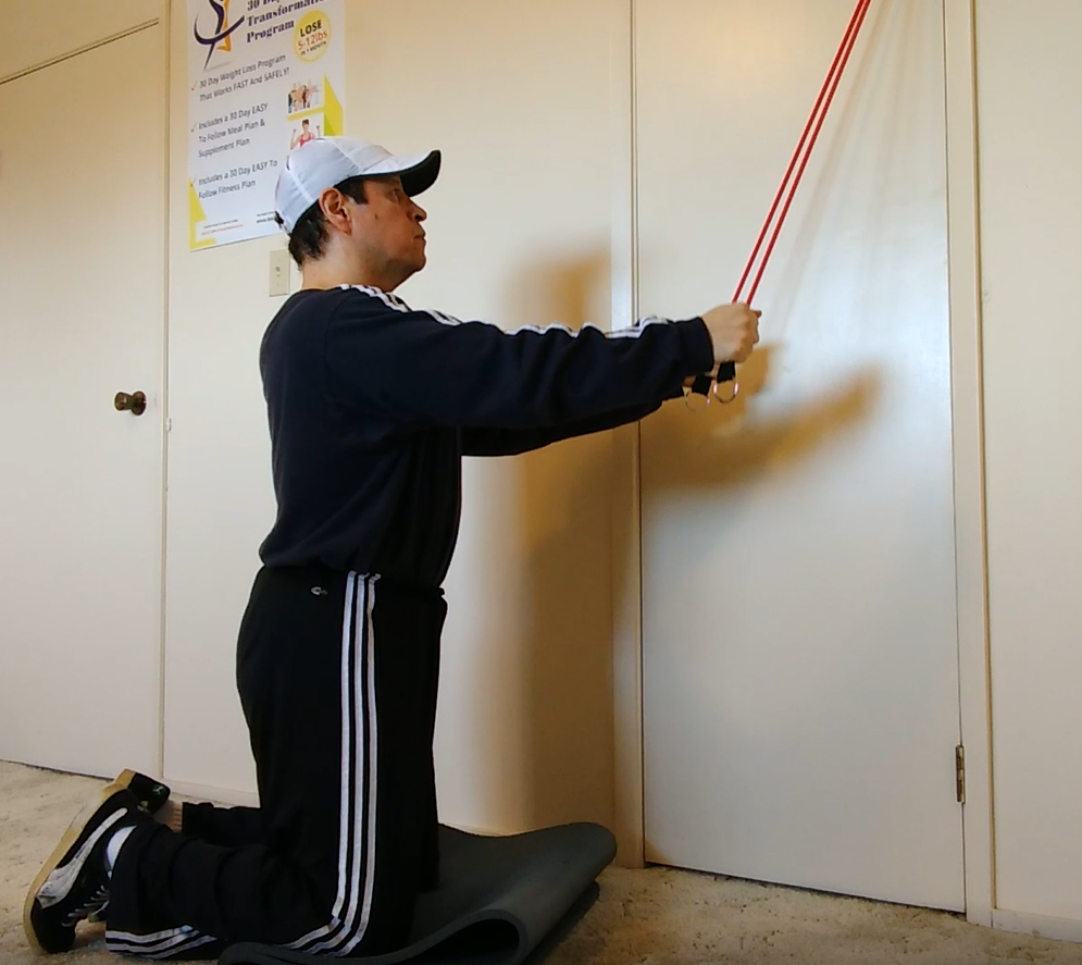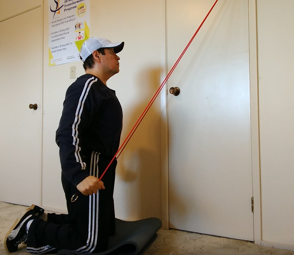 I also kneel when I perform this exercise because when I stand there is not enough tension. By kneeling, there is just enough resistance and I can perform the full range of motion needed to optimize the effectiveness of the resistance band straight arm extension exercise.