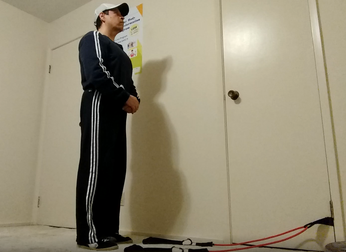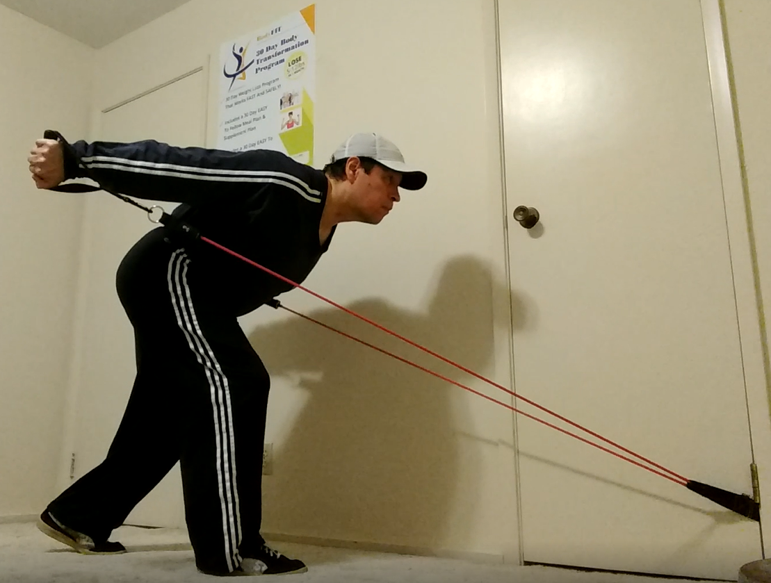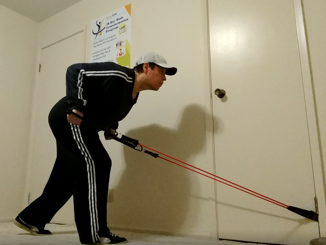 Place the resistance band anchor near the top of the doorway (right above the top door hinge). The handles should be a few feet apart allowing you to step in between them to grab with each hand. Step forward (from the ready position) and grab each of the handles with both hands. Take a few steps back until you feel some tension in the resistance bands. Take a small step backwards and bend at the waist until your upper body is almost parallel to the floor. Pull your upper arms upwards and bend at the elbow. Your upper arms should be just above your upper body and positioned in the same angle. Your back should be straight and your head level. Pick a spot on the wall and stare at it for the duration of the movement.