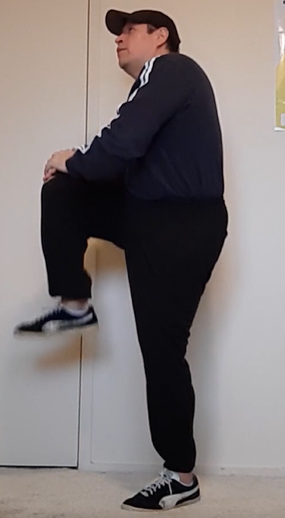 To start, clasp your hands together (left hand over right) and raise both hands over the right side of your head. Bring both hands down while at the same time raise your right knee. Slightly “crunch” your upper body downwards while touching your knee with your hands. Raise your hands back upwards and lower your knee towards the ground and repeat for the prescribed amount of repetitions. Perform the same motion for the left side of your body.