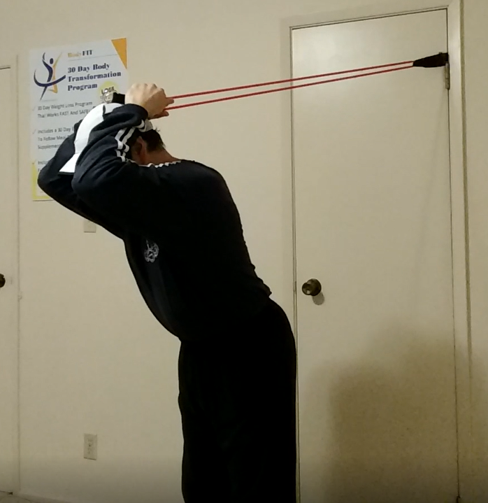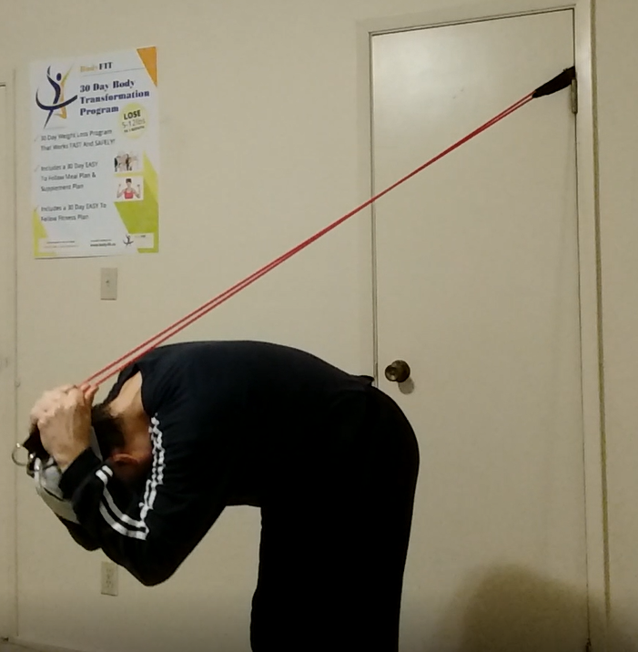 Place the resistance band anchor near the top of the doorway (just above the top door hinge). Approach the resistance bands and grab them with both hands. Turn away from the door and take a few steps forward until you feel some tension in the resistance bands. Bend your arms so that your hands are just behind your ears and arms bent at 90 degrees. Bend slightly at the waist until you feel some muscle tension and contraction in your abdominal muscles.