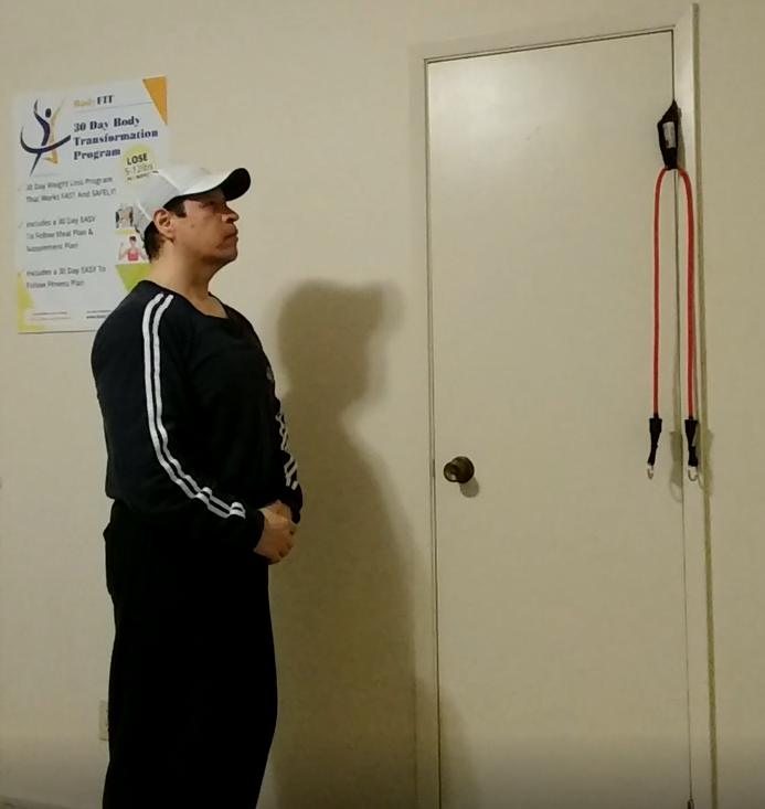 Once you’ve completed the exercise, slowly lift your arms upwards and turn your body towards the door and walk the resistance bands back. Do NOT let go of the resistance bands in the contracted position.