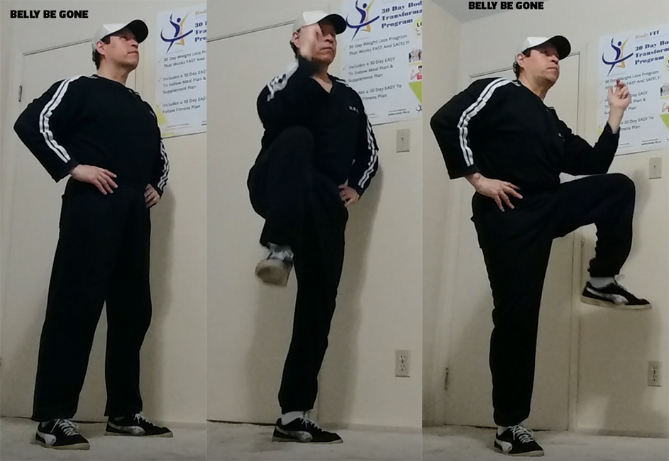 Lift your right knee up and bend at your right side with your arm bent. Try and lightly touch your elbow to your knee area (although you don’t have to touch it, just get close). Lower your leg and repeat the movement. After you’ve completed the prescribed amount of repetitions, perform the same movement for the left side of your body, lifting your left leg and using your left arm to touch.